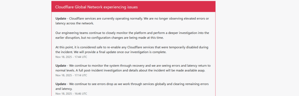 Nov 18, 2025 – 17:44 UTCUpdate – We continue to monitor the system through recovery and we are seeing errors and latency return to normal levels. A full post-incident investigation and details about the incident will be made available asap.